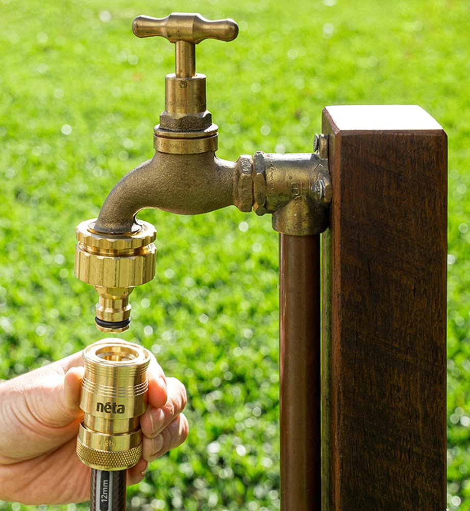 Quickly and easily connects a 12mm hose to 12mm sprayers, guns, nozzles, couplers and click-on tap adaptors. Features the Neta Long Claw Grip Ring for leak-free watering.