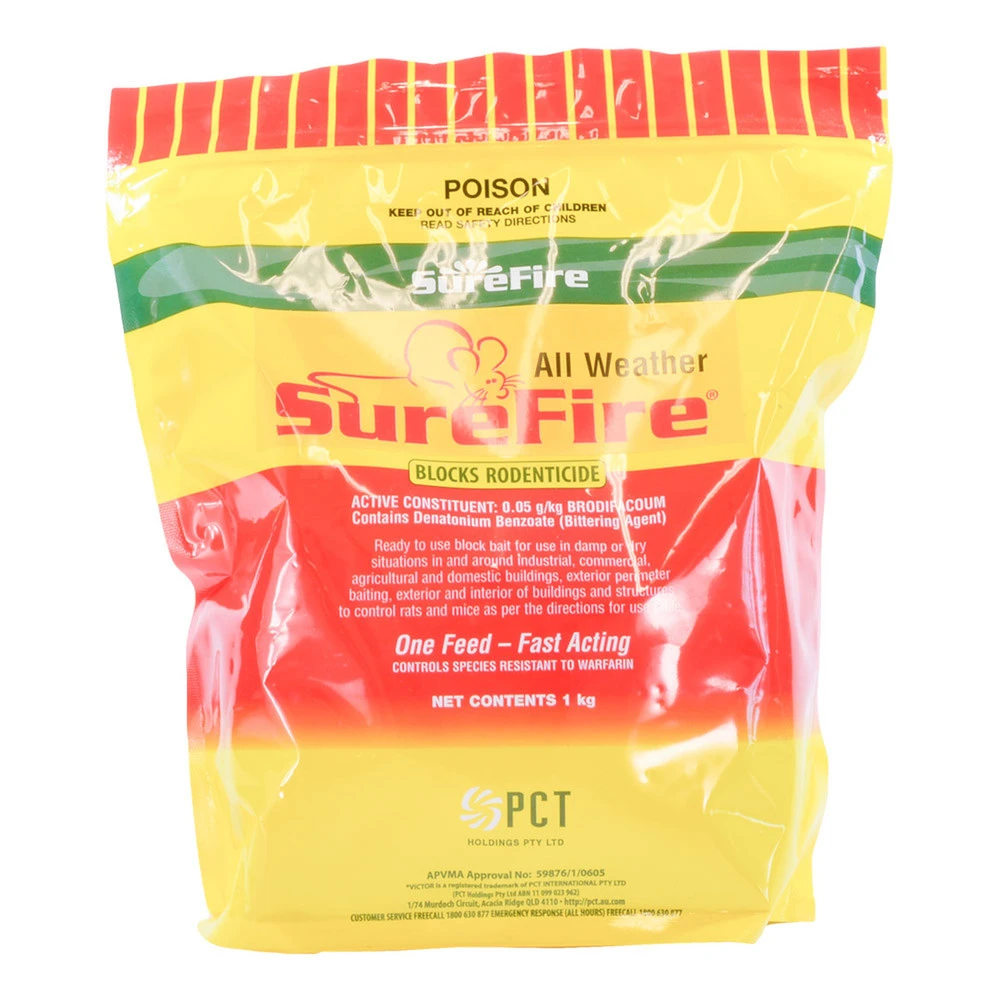 Our Surefire All Weather Rodent Blocks are ready-to-use, wax-based block baits that can be used in dry and damp situations. They are designed to effectively control rodents in and around industrial, commercial, agricultural, and domestic buildings, as well as the exterior and interior of various structures. Boasting a one-feed, fast-acting formula, these rodent control blocks can control species resistant to warfarin, ensuring maximum effectiveness in eradicating rodent problems.